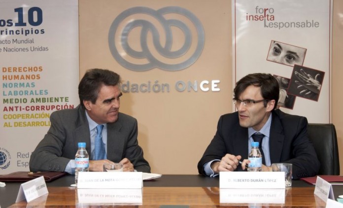 El presidente de la Red Española del Pacto Mundial de Naciones Unidad, Juan de la Mota, y el vicepresidente ejecutivo de Fundación ONCE, Alberto Durán, han sellado una alianza por la que la Red Española de esta iniciativa internacional se convierte en entidad colaboradora del Foro Inserta Responsable, y al mismo tiempo Fundación ONCE y FSC Inserta firman  su adhesión a la Red Española del Pacto Mundial de Naciones Unidas (‘United Nations Global Compact’).