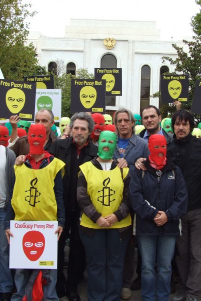 La imagen de las integrantes de Pussy Riot con capuchas de colores se ha convertido en un símbolo de la libertad de expresión en el mundo. Amnistía Internacional reunió ayer frente a la Embajada de Rusia en Madrid a cerca de 100 activistas y simpatizantes de la organización con capuchas de colores para pedir su liberación.