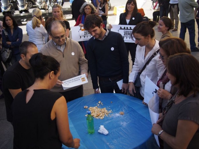 Con motivo del día mundial para la Erradicación de la Pobreza la campaña Pobresa Zero ha realizado a las puertas del Palau de la Generalitat, el acto simbólico ‘Restaurante Sinsabores del mundo’ a través del cual se ha denunciado la desigualdad en el reparto de la riqueza en el mundo.