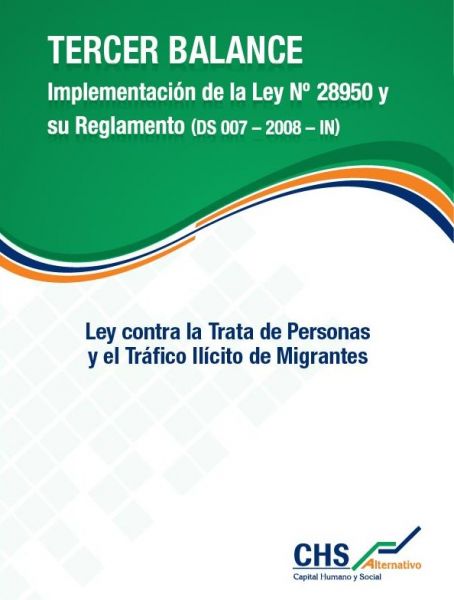 La publicación Tercer Balance: Implementación de la Ley Nº 28950 y su Reglamento da a conocer los principales avances en el desarrollo de las políticas públicas contra la trata de personas y el tráfico ilícito de migrantes, a través de un recuento de las acciones del Estado relacionadas a la prevención y persecución del delito; así como, a la protección y asistencia de sus víctimas. Esto a partir de la información proporcionada por las propias instituciones públicas con responsabilidades asignadas en la Ley.