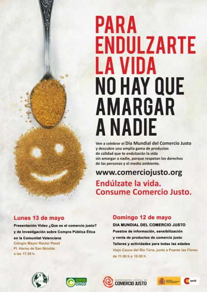 Con el lema “Para endulzarte la vida no hay que amargar a nadie”, el próximo domingo 12 de mayo, Valencia y otras localidades de la Comunitat Valenciana celebrarán el Día Mundial del Comercio Justo, que este año tendrá al azúcar como protagonista.