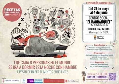 Cruz Roja Española presentó ayer martes 21 de mayo a las 19:30 horas en el Centro Social “El Barranquet” de El Campello la exposición interactiva de la campaña “Recetas para un mundo sin hambre”. Se trata de una muestra incluida en el Circuito Solidario de la Diputación Provincial de Alicante que recorrerá un total de diez localidades de toda la provincia, con el fin de exponer la desigualdad del reparto de los alimentos en el mundo y realizar propuestas para cambiar esta realidad.