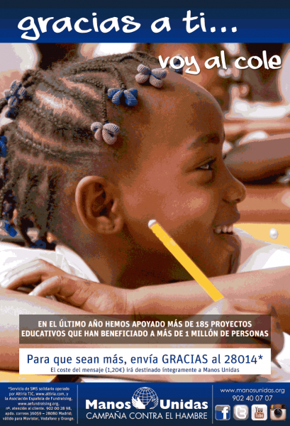 Unida a esta iniciativa informativa, de sensibilización y de transparencia, y teniendo en cuenta que las ayudas públicas a la Cooperación y la Educación para el Desarrollo están sufriendo graves recortes (esta partida ha descendido en la organización un 24,7%), Manos Unidas ha ofrecido también la posibilidad de colaborar con sus proyectos realizando microdonaciones de 1,20 €, enviando un SMS al 28014 con la palabra “GRACIAS”, iniciativa que continuará activa hasta final de año.