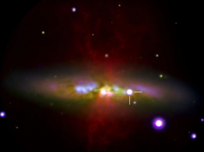 Así, no es de extrañar que la supernova SN 2014J y la galaxia M 82 se hayan convertido en la noticia astronómica de los últimos días. Desde el Telescopio William Herschel (WHT), perteneciente al Isaac Newton Group (ING) del Observatorio del Roque de los Muchachos (isla de La Palma, España) los astrofísico Manuel Moreno- Raya (CIEMAT, España) y Lluís Galbany (DAS/UC, Chile) han podido observar con detalle supernova y galaxia entre el jueves 23 y el domingo 26 de enero usando tanto imágenes como espectros. Los datos fueron analizados conjuntamente con el astrofísico Ángel López-Sánchez (AAO/MQ, Australia), quien se dedicó a “combinar” las imágenes y los espectros. La imagen adjunta señala la supernova dentro de la galaxia M 82, de la que se han sacado todos sus detalles: las bandas de polvo que atraviesan el disco (negro-amarillo), los intensos brotes de formación estelar (en azul) y sobre todo la estructura filamentosa del superviento galáctico (en rojo) de gas caliente e ionizado que se escapa de forma perpendicular al disco de la galaxia. La SN 2014J destaca claramente sobre la propia galaxia.