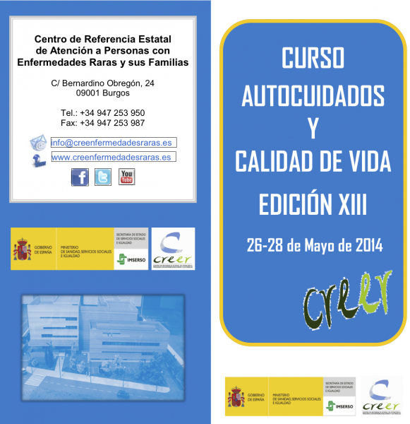 Recordamos que el miércoles 14 de mayo de 2014 finaliza el plazo de inscripción en la Edición XIII del Curso Autocuidados y Calidad de Vida del CREER dirigido a familiares y/o cuidadores de personas afectadas de Enfermedades Raras.