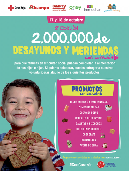 Cruz Roja, las empresas del Grupo Auchan en España (Alcampo, Simply, Oney e Immochan) y el proyecto “Un juguete una ilusión”, ponen en marcha los próximos días 17 y 18 de octubre la II campaña de recogida de alimentos Desayunos y Meriendas #ConCorazón.