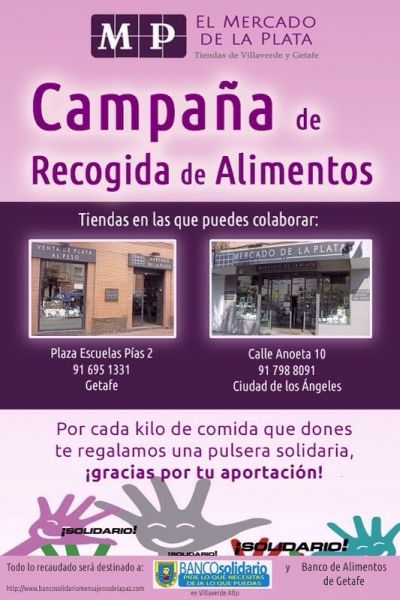 Las tiendas Mercado de la Plata de Villaverde y Getafe inician una campaña de recogida de alimentos no perecederos que serán distribuidos a familias del distrito en situación de riesgo social a consecuencia de la crisis, a través del Banco Solidario que Mensajeros de la Paz tiene en Villaverde Alto.
