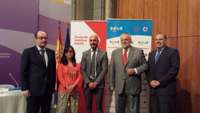 (Madrid, 11 de junio de 2015).- José Fabián Cámara, Presidente de DOWN ESPAÑA y Santiago Moreno, Director General de la Fundación Vodafone España, han renovado esta mañana un convenio de colaboración para poner en marcha el segundo año del proyecto “Yo me prep@ro”, un programa de formación en TIC’S para jóvenes y adultos con síndrome de Down y discapacidad intelectual dirigido a la inserción laboral en empresas ordinarias. El acto se ha celebrado en la Secretaría de Estado de Asuntos Sociales e Igualdad y ha contado con la presencia de Jesús Celada, Subdirector General de Participación y Entidades Tuteladas del Ministerio de Sanidad, Servicios Sociales e Igualdad.