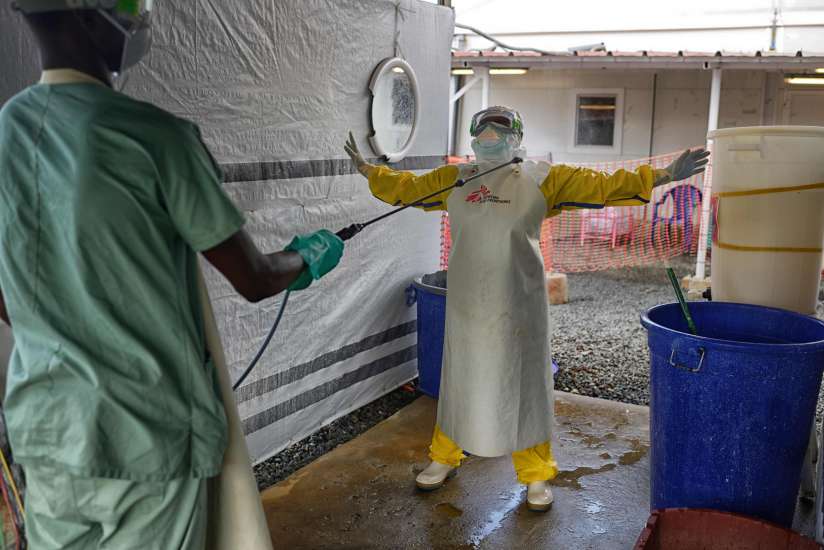 A Medecins Sans Frontiers (MSF) health worker gets disinfected with chlorine as they high risk zone at the MSF Ebola treatment center in Conakry