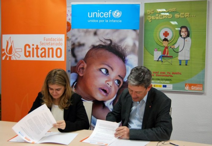 El director de la Fundación Secretariado Gitano (FSG), Isidro Rodríguez, y la directora ejecutiva de UNICEF España, Paloma Escudero, firmaron la pasada semana en Madrid un convenio de colaboración que, entre otras cosas, permitirá a la FSG realizar un estudio comparado sobre la situación educativa del alumnado gitano español en educación secundaria. Financiado por el Ministerio de Sanidad, servicios Sociales e Igualdad, UNICEF España y contando con la colaboración del Ministerio de Educación, Cultura y Deporte el estudio estará disponible en el primer trimestre de 2013.
