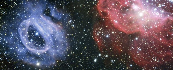El telescopio VLT (Very Large Telescope) de ESO ha obtenido imágenes de una fascinante región de formación de estrellas en la Gran Nube de Magallanes — una de las galaxias satélite de la Vía Láctea. Esta precisa imagen revela dos peculiares y brillantes nubes de gas: la rojiza NGC 2014 y su vecina azulada NGC 2020. Pese a que son muy diferentes, ambas fueron esculpidas por potentes vientos estelares procedentes de estrellas recién nacidas extremadamente calientes que también irradian el gas, provocando que brille de forma intensa.