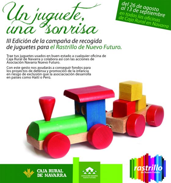 Por tercer año consecutivo Asociación Navarra Nuevo Futuro y Caja Rural de Navarra van a poner en marcha la campaña ‛Un Juguete, una Sonrisa’ con el fin de recoger juguetes usados que, estando en buen estado, puedan tener una segunda vida con un fin, además, solidario.