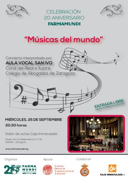 Zaragoza, 18 de septiembre de 2013.- Con motivo del 20 aniversario de Farmamundi, la ONG organiza un concierto gratuito de la mano del Aula Vocal San Ivo. La coral del Real e Ilustre Colegio de Abogados de Zaragoza ofrecerá un selecto repertorio, durante una hora, bajo el título Músicas del mundo, con el fin de apoyar a la ONG, que lleva dos décadas defendiendo el derecho a la salud de los más vulnerables.