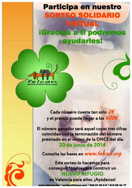 Felcan ha organizado un sorteo benéfico virtual en el que el ganador puede ser premiado hasta con 600 euros. Desde ya hasta el 20 de junio, se podrán adquirir por medio del email sorteo@felcan.org diferentes participaciones para optar al 30% de la recaudación de los números vendidos.