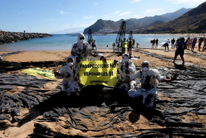 28 de junio de 2014 .- Esta tarde activistas de Greenpeace han simulado un vertido de petróleo en la tinerfeña playa de las Teresitas para alertar de la peligrosidad de las prospecciones petrolíferas en el mar y mostrar lo que podría ser una realidad si no se impide que se produzcan.