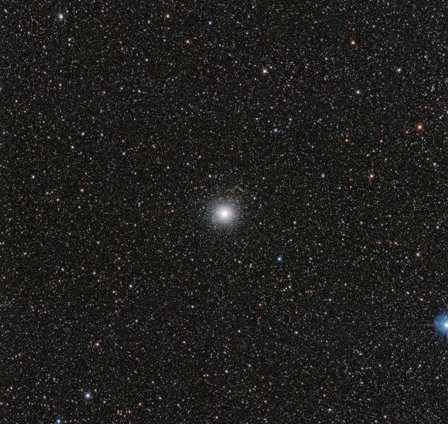 Esta nueva imagen del cúmulo fue creada a partir de datos obtenidos con el telescopio de rastreo VST (VLT Survey Telescope), instalado en el Observatorio Paranal. Además de mostrar el propio cúmulo, podemos ver un grupo extraordinariamente denso de estrellas de la Vía Láctea, mucho más cercanas, que se encuentran en primer plano.