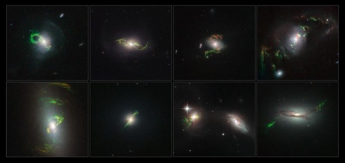 Not only are the green filaments far from the centres of their host galaxies, they are also immense in size, spanning tens of thousands of light-years. They are thought to be long tails of gas formed during a violent past merger between galaxies — this event would have caused strong gravitational forces that would rip apart the galactic participants.