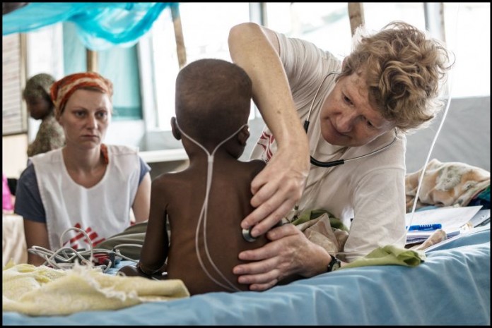 South Sudan, Malakal, Base of the Un (PoC). Medical staff of MSF at work in the clinic inside the UN compound. MSf is treating patients with Kala Azar, TB and malnourished children in their clinic.Also war injuries of the outside conflict are treated in the clinic.