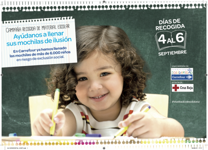 La Fundación Solidaridad Carrefour y Cruz Roja Española ponen en marcha la séptima edición de la “Vuelta al Cole Solidaria”, una iniciativa que se celebrará los próximos días 4, 5 y 6 de septiembre en 43 provincias españolas en las que las dos entidades recogerán material escolar para familias con niños en edad escolar que estén atravesando por dificultades económicas.