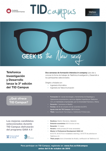 Madrid, septiembre de 2015.- La Fundación Universidad-Empresa ha abierto el plazo de presentación de solicitudes para participar en la tercera edición de TID CAMPUS, promovida por la compañía tecnológica líder Telefónica Investigación y Desarrollo, que se desarrollará entre el 26 de octubre y el 6 de noviembre de 2015 en Madrid.