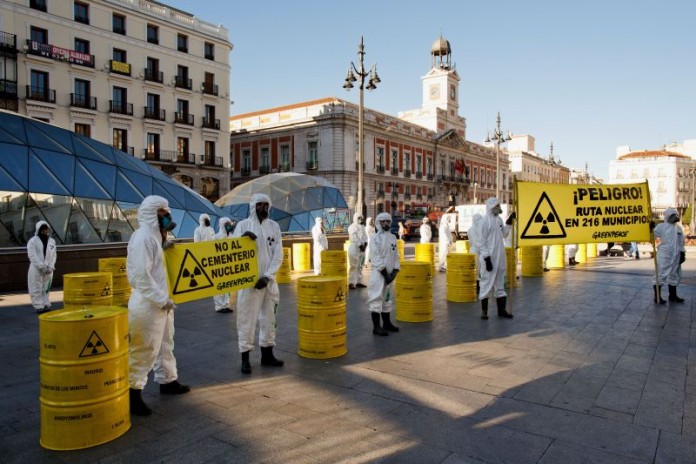 18 de septiembre de 2015 .- Hoy a las 9:00 de la mañana, activistas de Greenpeace han llevado al kilómetro cero en la Puerta del Sol de Madrid una treintena de «bidones de residuos nucleares radiactivos“ para representar el peligro que podría suponer el transporte de residuos nucleares hasta el Almacén Temporal Centralizado de Residuos Radiactivos (ATC) de Villar de Cañas (Cuenca), en caso de que este finalmente se lleve a cabo. Los activistas, ataviados con monos y máscaras han portado pancartas con el lema: ”¡Peligro! Ruta nuclear en 216 municipios“ y ”No al cementerio nuclear«. Con esta acción, la organización ecologista quiere pedir al Gobierno una moratoria a este innecesario y caro proyecto.
