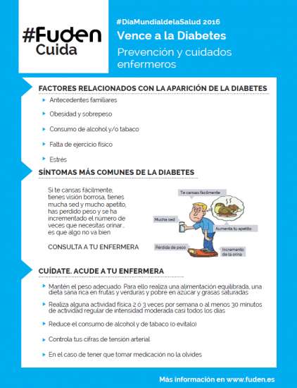 • Con motivo de la celebración del Día Mundial de la Salud 2016 centrado en la diabetes, la Fundación para el Desarrollo de la Enfermería, FUDEN, reclama a las administraciones sanitarias que dirijan sus esfuerzos a fomentar estrategias de prevención de la mano de la enfermería.