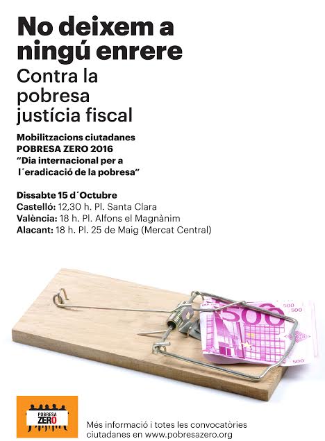 Pobresa Zero convoca movilizaciones en 17 localidades valencianas destacando las manifestaciones en Valencia y Alicante, así como una concentración en Castellón el próximo sábado 15 de octubre, con el fin de exigir un sistema que garantice la equidad y los derechos de las personas en todo el mundo y que sea respetuoso con el medio ambiente. Estos actos serán precedidos el viernes 14 por la celebración de la III Nit Solidària ‘Dóna’m la mà’ en el Teatro Principal de Valencia. Las acciones se enmarcan en la Semana contra la Pobreza que culminará el lunes 17 de octubre, Día Internacional para la Erradicación de la Pobreza.