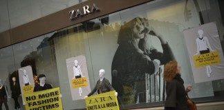 Ayer, escaladores de Greenpeace han desplegado una gran pancarta en la fachada de la tienda de Zara en la madrileña calle de la Princesa con...